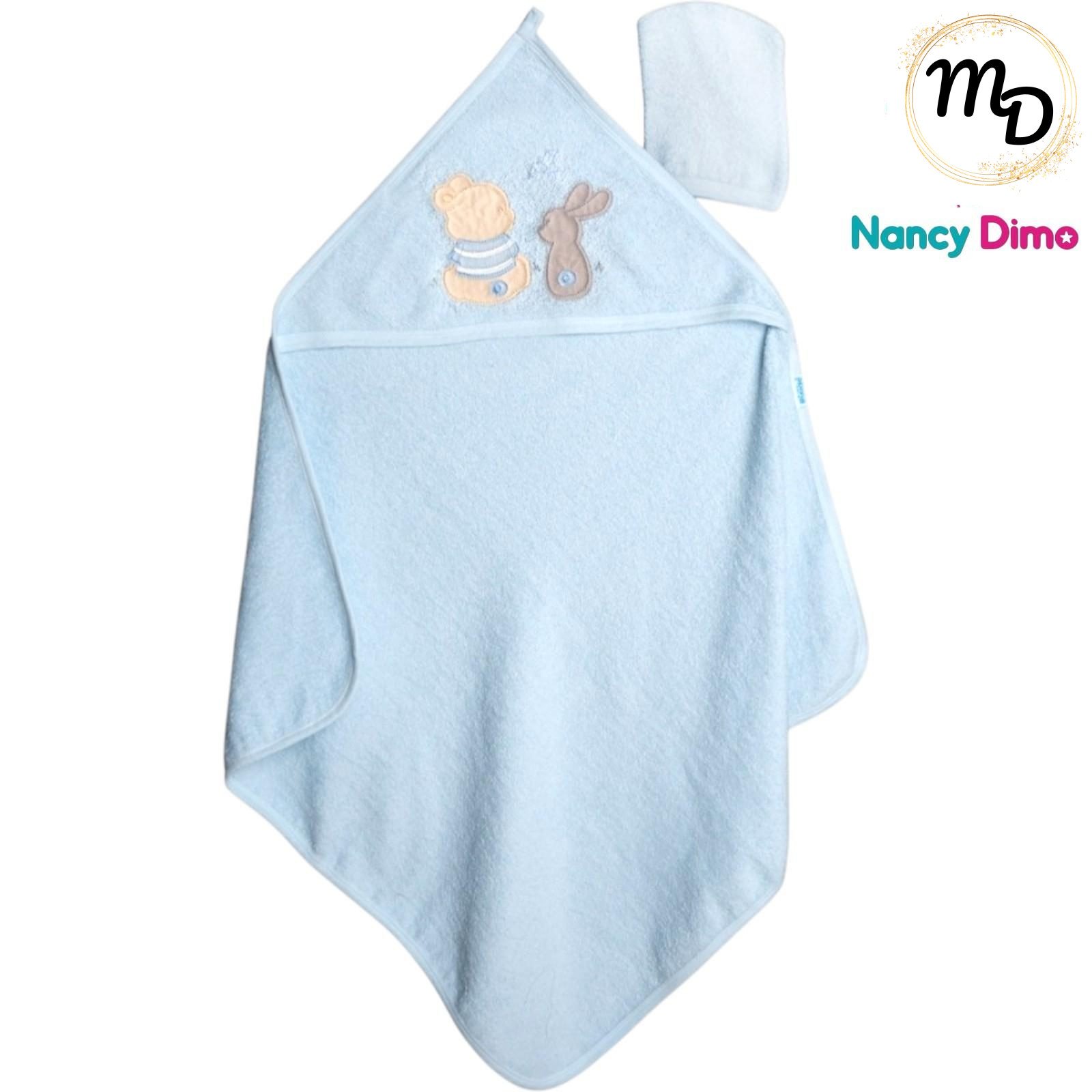 Βρεφική Κάπα Μπουρνούζι Μπάνιου με κουκούλα και γάντι μπάνιου ειδικά σχεδιασμένη για να καλύπτεται και το κεφαλάκι του μωρού αμέσως μετά το μπάνιο