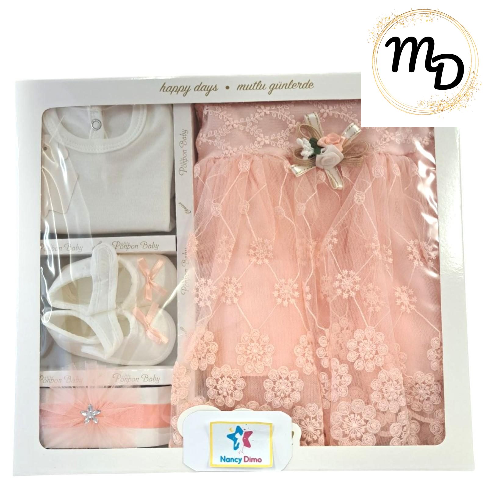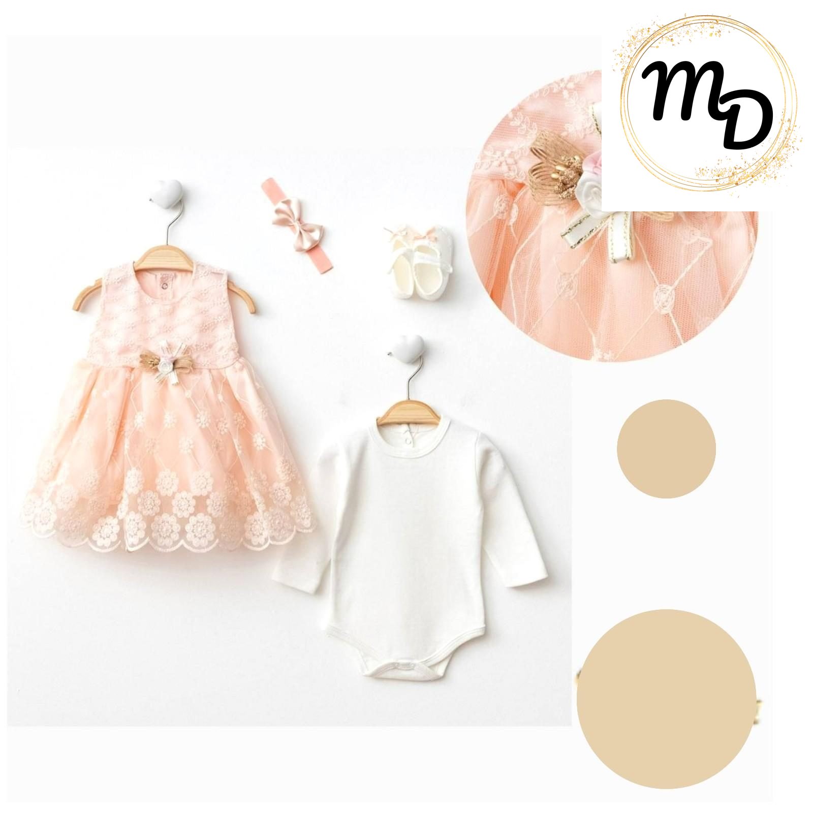 Σετ βρεφικό με φόρεμα,καλσόν, παπουτσάκια,κορδέλα,ολόσωμο φορμάκι για 6-9 μηνών