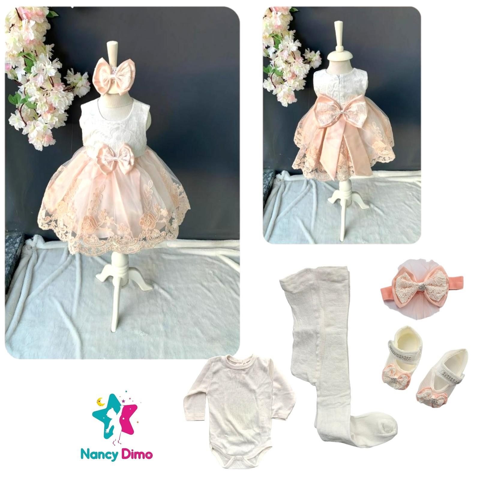 Σετ βρεφικό με φόρεμα,καλσόν, παπουτσάκια,κορδέλα,ολόσωμο φορμάκι για 6-9 μηνών