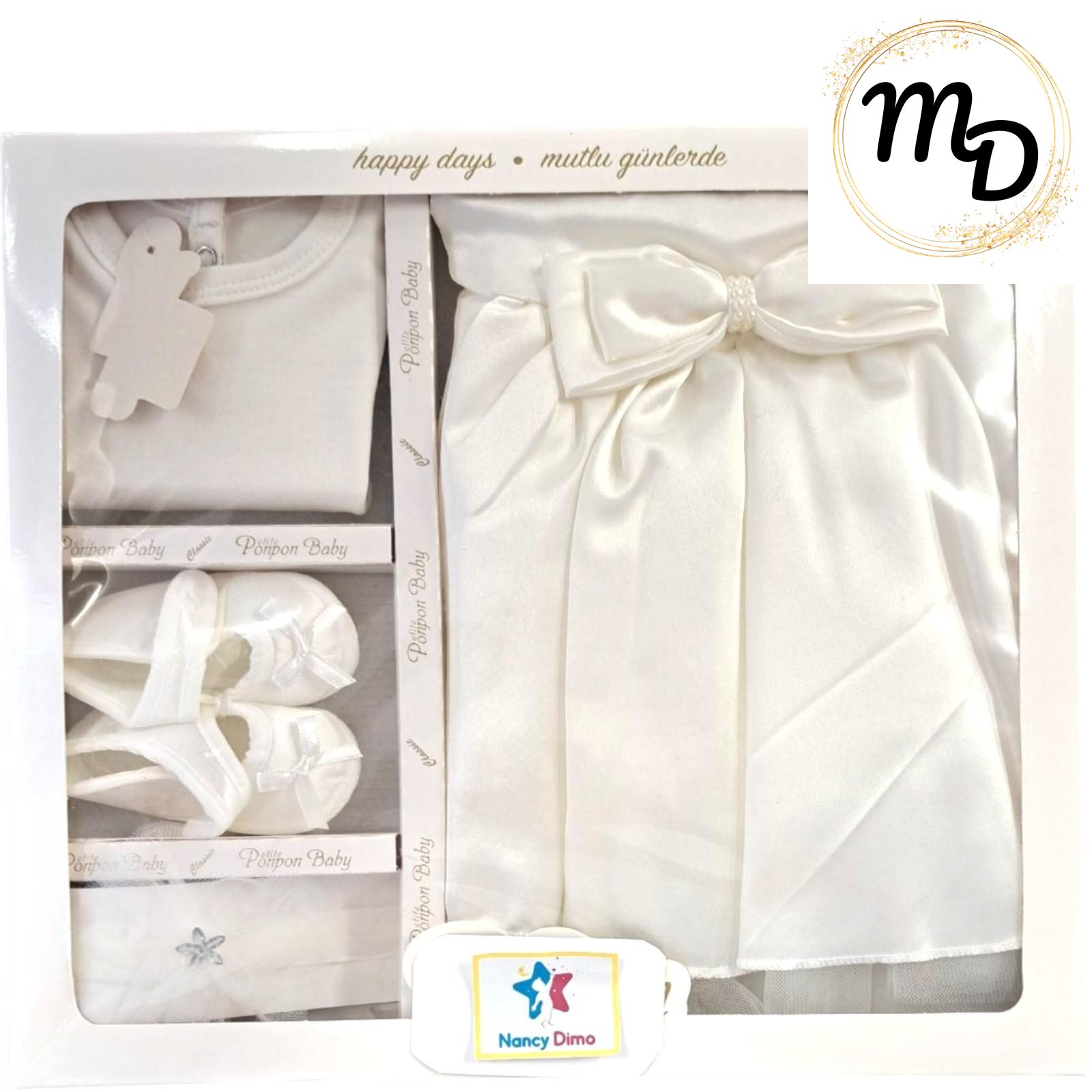 Σετ βρεφικό με φόρεμα,καλσόν, παπουτσάκια,κορδέλα,ολόσωμο φορμάκι για 6-9 μηνών