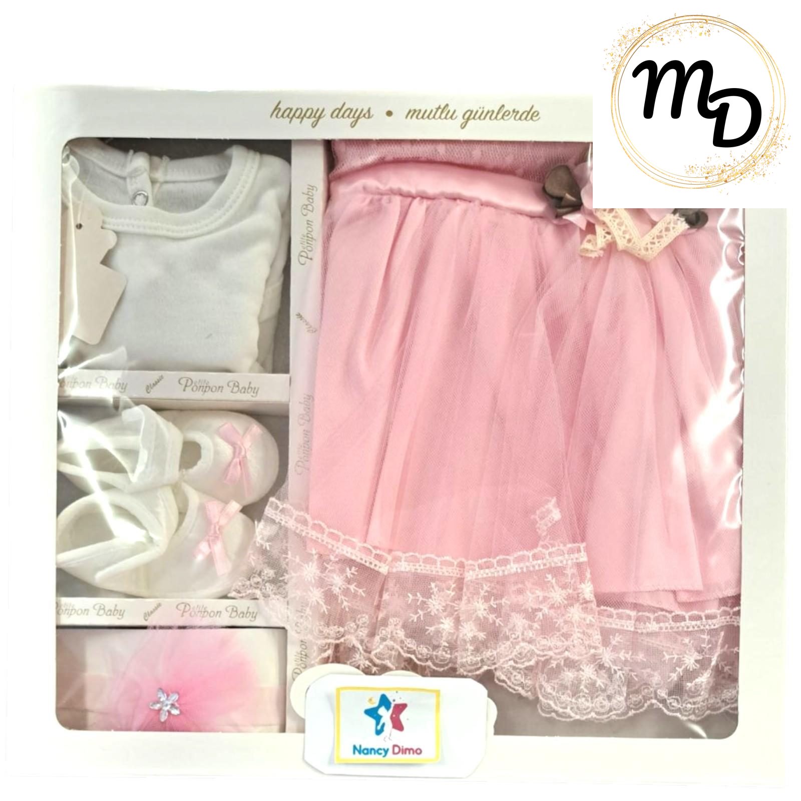 Σετ βρεφικό με φόρεμα,καλσόν, παπουτσάκια,κορδέλα,ολόσωμο φορμάκι για 6-9 μηνών