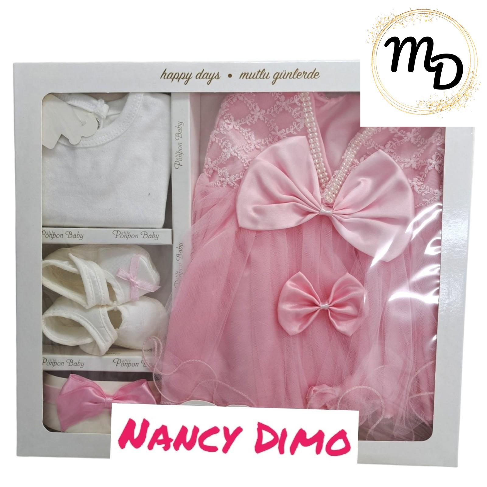Σετ βρεφικό με φόρεμα,καλσόν, παπουτσάκια,κορδέλα,ολόσωμο φορμάκι για 6-9 μηνών