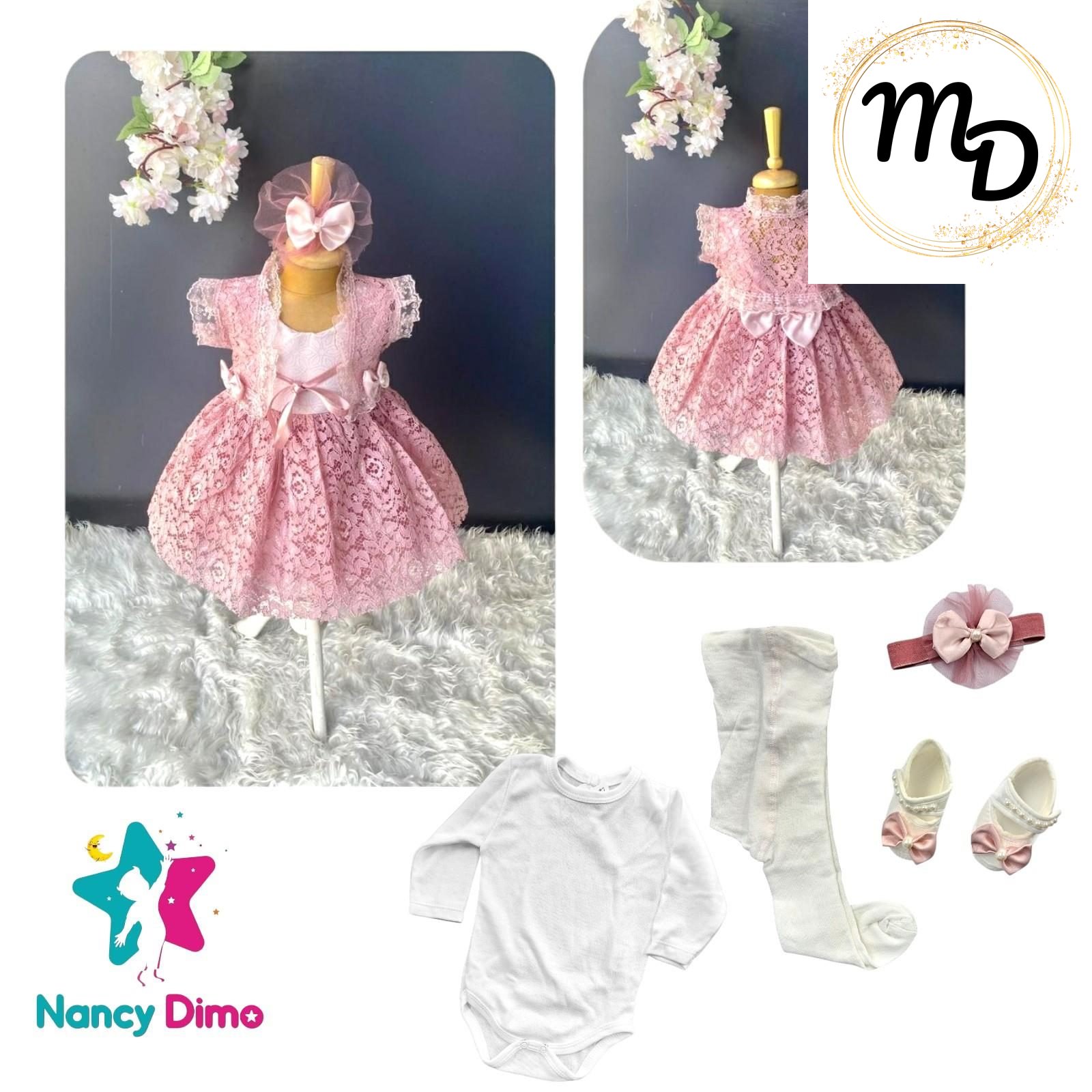 Σετ βρεφικό με φόρεμα,καλσόν, παπουτσάκια,κορδέλα,ολόσωμο φορμάκι για 6-9 μηνών
